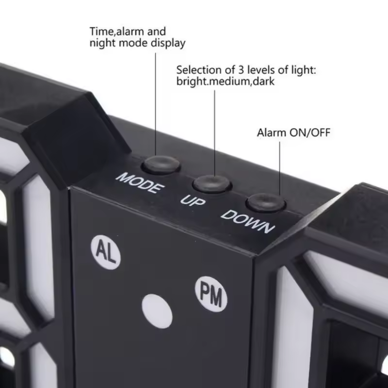Memory mode: When a memory battery is installed, it will automatically travel when there is no power supply. When there is no battery or power supply, remember the latest clock and various setting modes Note: The memory battery has no power supply function and can only remember the time. USB cable power supply Material: Acrylic + ABS Color: black, white Light color: white, pink, blue, orange Size: 16.3*6cm Function: time, temperature, year and month Battery: CR2032 (not included) (Note: The storage time when the battery is used to cut off the power, the clock is powered by the USB cable) Power supply: DC 5V DC power supply Features: 1.LED time display 2. Wall Clocks Display time, date, temperature, alarm clock 3. Temperature range 0°C-50°C (32°F-122°F) 4. Brightness automatic dimming kinetic energy 5.4 buttons: SET UP DOWN RESET 6. Date: January 1, 2000 - December 31, 2099 7. LED screen automatically performs time, date and temperature conversion 8.AL1, AL2, AL3 three alarm clocks 9. Can be placed on the desktop or wall hanging 10. The clock will automatically lower LED brightness under night mode, press MODE twice times to enter night mode. Package includes: 1PCS*LED clock(without battery) 1PCS*power cord 1PCS*instruction manual